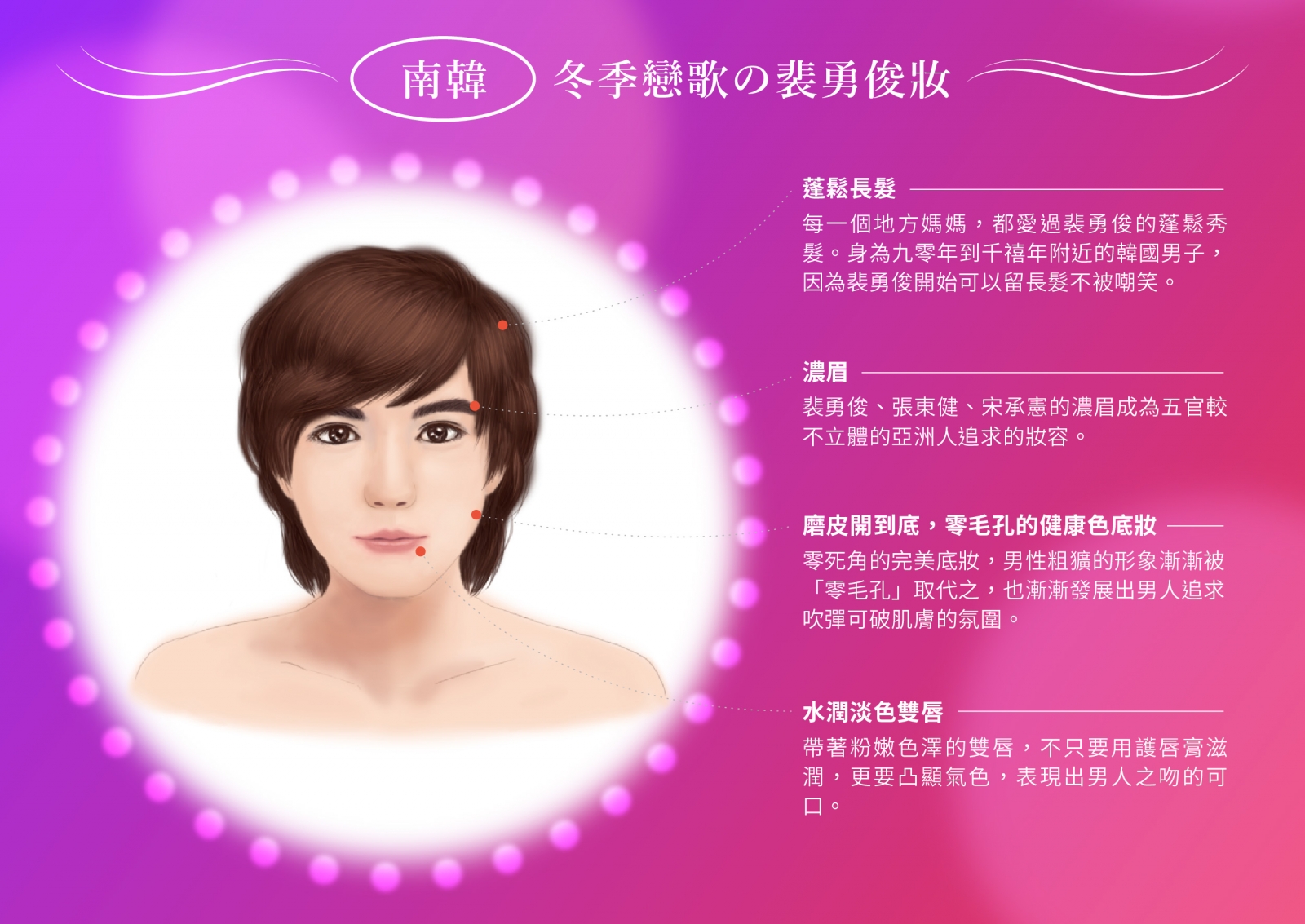 九零年後,跟隨日本漫畫裡花樣男子形象的輸入與韓國偶像劇的盛行,開始出現許多臉孔精緻、身材壯碩的「花美男」,Rain、裴勇俊、男子偶像團體在外觀上模糊陽剛與陰性氣質,但同時,2003 年後盛行的「momjjang」(意為:如果你想要在生活中成功,必須要擁有完美的臉蛋和身材)也使得男男女女都追逐著苗條緊緻與肌肉的身材。 花美男帶動著南韓文化的強勢輸出,K-POP 的崛起在九零年後製造出不少紅極一時的男子妝容,從初期的煙燻妝到裸素顏妝容、吸血鬼妝,男子化妝不再只限於眉毛與底妝,同時注重眼妝、陰影、唇色,也發展出南韓強大的美妝市場。