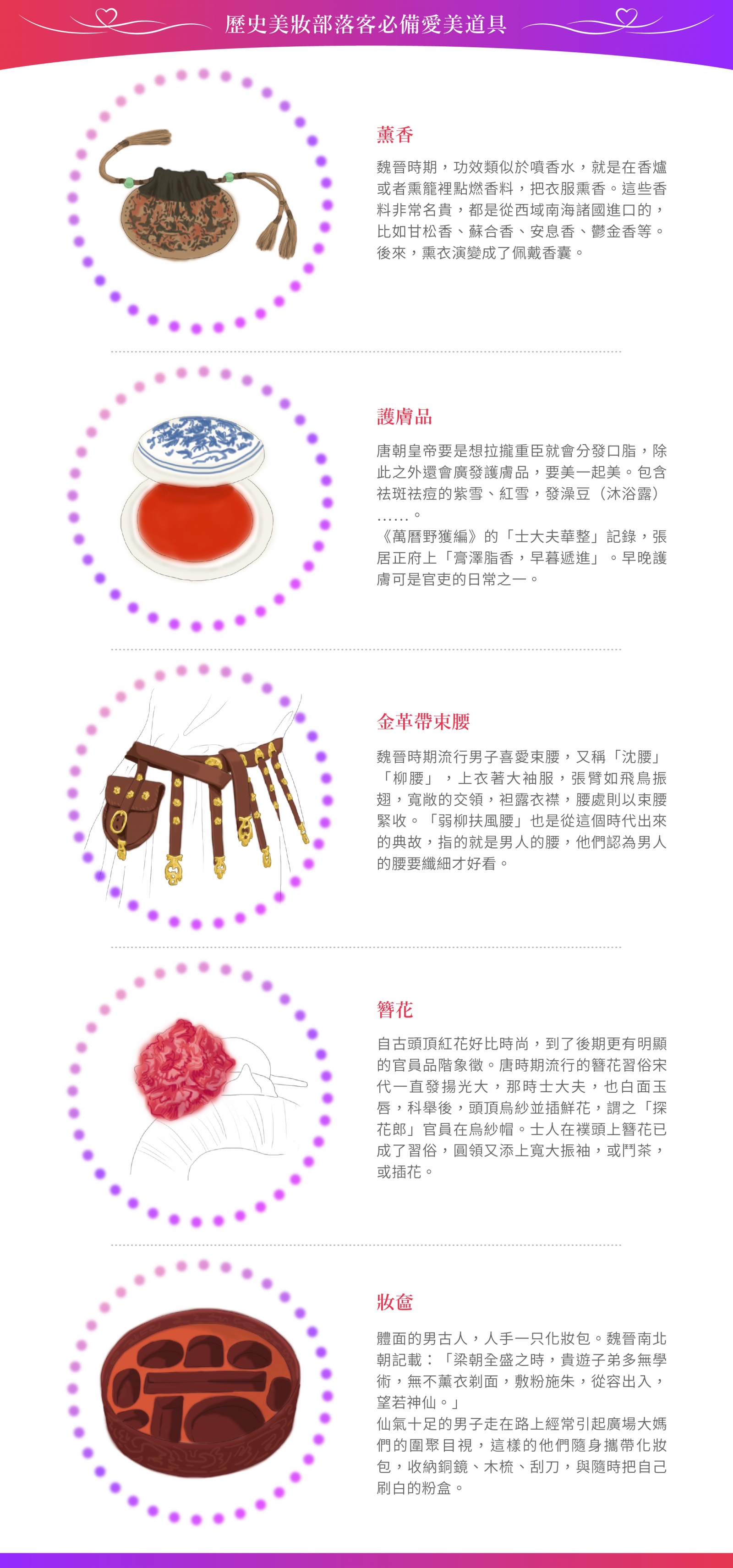 魏晉崇尚陰柔扮相,除臉部妝容,古語:「尚書何晏,好服婦人之服」,所謂的婦人之服,即為透視裝、吊帶紗裙。