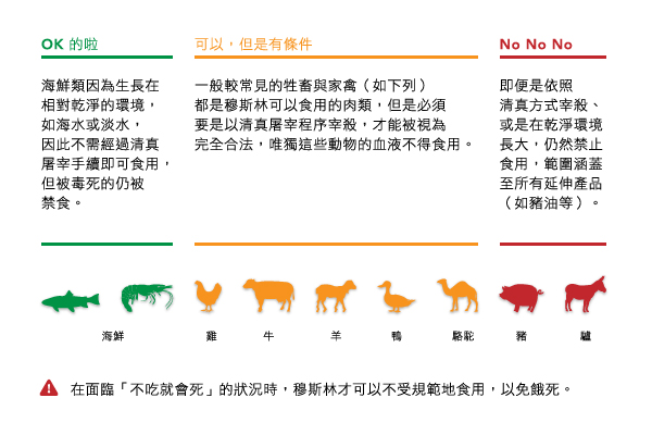 其實,吃素的人或許在飲食方面會遭遇的麻煩比穆斯林還要多,因為以一般食材而言,在符合清真條件之下宰殺的肉都可以吃(如牛、羊、雞),若沒這些選擇,海鮮類是不需要穆斯林宰殺便可食用,若都沒有,那吃素菜也是可以的。伊斯蘭的飲食規則所涵蓋的面向其實極為廣闊,因此本文謹以概要的方式向各位介紹。用文字解說有時候會在字裡行間迷路,不如用簡單的圖表把穆斯林可以和不能吃的肉類食材分類。