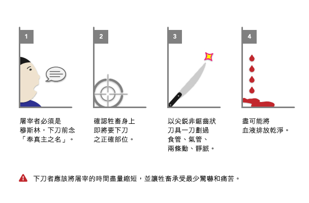 清真的宰殺方式也不是念過「奉真主之名」就好,其實後續有別於一般的處理方式也很重要。牲畜應該以最溫和的方式被帶至宰殺處,在確認要下刀的位置之後才可拿出屠刀,屠刀必須是要尖銳的非鋸齒刀,且得一刀劃過牲畜喉頭至頸部的食管、氣管及兩條動、靜脈,盡量減少牲畜要承受的驚嚇和痛苦。下刀同時得確保動物的神經系統不被破壞,以免動物在放血之前就死掉。牲畜宰殺後必須放血,肉品在盡可能排放血液之後才可食用,對穆斯林而言,畜體的血液是跟豬肉一樣被禁止食用的,如今逐漸有事實證明畜體放出的血液帶有細菌及毒素,對人類有害。從宰殺方式到後續的肉品處理,都可見伊斯蘭對食品衛生的重視。