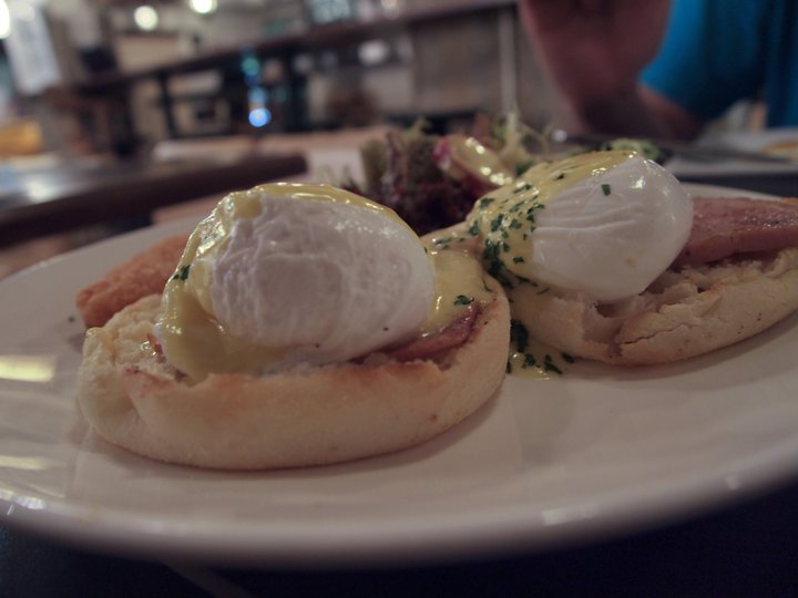 這裏最受歡迎的一定就是 Eggs Benedict 。我從來都不知道 Eggs Benedict 中文要怎麼稱呼,但這已經不重要了。(編按:台灣部分店家採直接音譯為「班乃迪克蛋」)這裏的 Eggs Benedict 有三種,可是我點的還是夾火腿的那一種,因為我從小就相信火腿跟蛋永遠都是最好的朋友。其實,怎麼樣的 Eggs Benedict 才是最棒的呢?重點就在水波蛋 ( Poached egg )。這裏的水波蛋是外熟內生的,切開時你會看到蛋黃流出,讓麵包滲滿香香的蛋汁,跟酸酸的荷蘭醬( Hollandaise sauce )混合在一起,這才是最完美的組合。