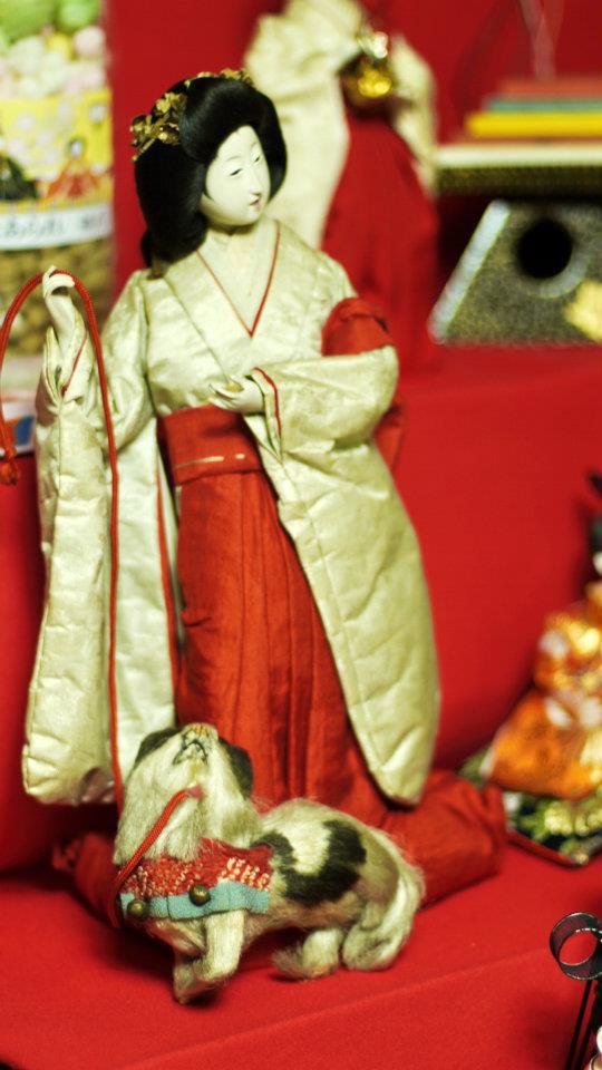 原來這是非常特別的「狆引き官女」(拉著「狆」這種寵物犬的官女),這種人偶,現代幾乎已不擺放了,非常少見。明治至昭和初期,有些人家會將「狆引き官女」和雛人偶一同擺放。由於當時孩童死亡率還很高,因此人們擺放「狆」這種容易飼養的犬類,用來祈求孩童能夠平安成長。