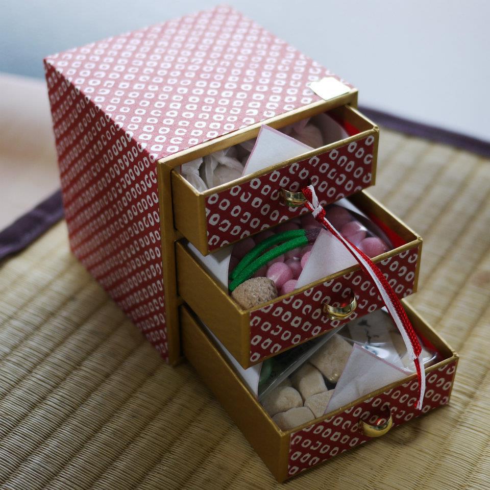 回到家,一層層卸下這盒菓子的包裝,我一面贊歎了起來。原來這款菓子叫做「千代簞笥」,「千代」便是萬代永世之意,「簞笥」指的就是衣櫃。整組雛人形當中,除了可愛的小人偶以外,也有好多小巧精緻的衣櫃、梳妝台等小道具,想來主人是特意選擇了這款裝在萬代永世衣櫃當中的干菓子了。