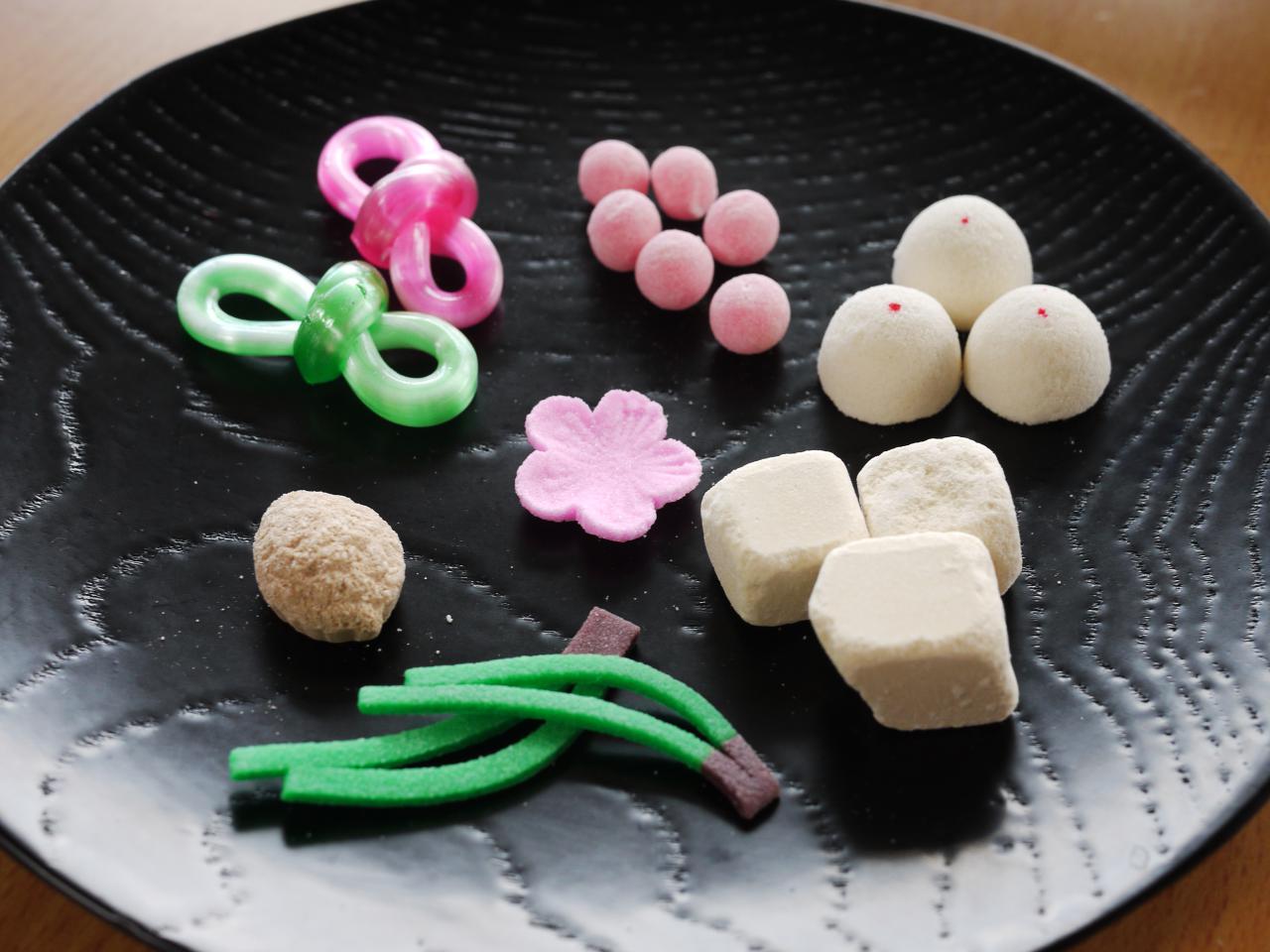 欣賞完精緻的雛人形,長輩邀我們到桌前,端出的是人偶形狀的和菓子──兩顆淺綠及粉紅的蛋形,用數層象徵衣服的薄皮包著,造形雖簡單,但一眼就可看出代表了天皇及皇后。還有個叫做「引千切」的菓子,說是京都代表女兒節的特殊菓子,底下是一片花瓣狀,上面堆著如雪花般的餡。主人端給我的是皇后菓子、及粉紅色的引千切,雖然我並非這家的女兒,但主人親切地幫我許了願,要我能夠平安健康。