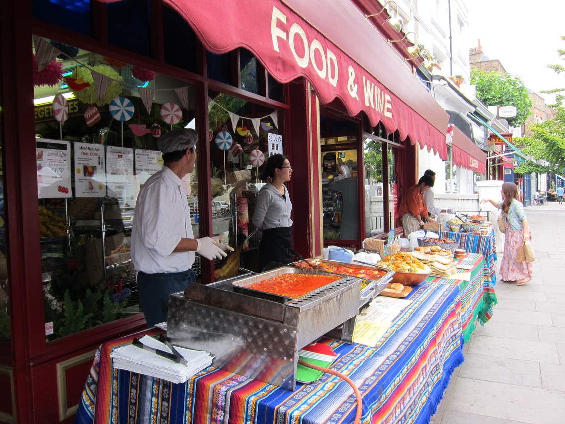 和學長約在 Chalk Farm 站,沿著小路往公園的方向走,路上陸續出現可愛廚具店、頗有阿瑪菲風情的義大利餐廳、日式麵包店,讓人忍不住駐足停留,但是我們真正的目標位在路的盡頭。酒紅色裝潢的小超市外面擺了長桌,上面是色彩鮮艷的各式冷蔬菜跟香氣撲鼻的大鍋飯;走進去一看,透明食物櫃裡有沙拉、鹹派、Janette 大推的雞排,還有咖哩角、炸球、蛋糕......我興奮地東指西指,店員一樣一樣小心包好,貼上標價,拿到櫃檯結帳。櫃台先生果然經驗老道,結帳時問了一句:「你們該不會要去公園野餐吧?」當然啊!他二話不說拿了一疊餐巾紙跟塑膠刀叉給我們,還在紙袋上用筆寫了大大的「FREE」。於是我們拎著一大袋食物跟櫃台先生的愛心餐具,懷裡抱著一瓶玫瑰酒,開心地朝攝政公園前進。