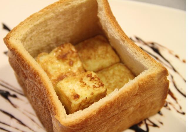 四、切成小塊的土司,放入平底鍋中煎到金黃。