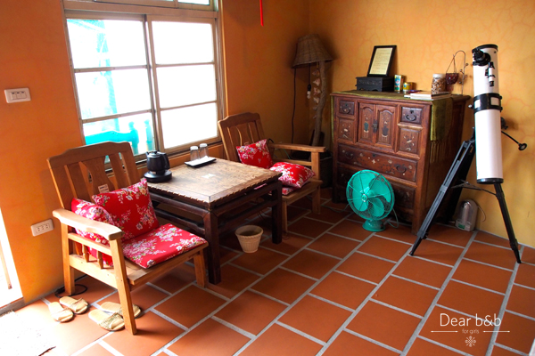 而雙人房不僅獨享一方植滿綠意的陽台院子,最令人驚艷的,就是那座專業的望遠鏡,入睡前向阿治借簡易的星座盤,夜裡用望遠鏡找出自己的星座,和另一半一起數星星,在這裡,睡不著變成一件好浪漫的事,怎樣都不會無聊。