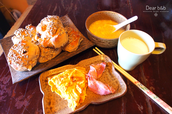 第二天早上,就算 12 點才睡醒的旅人,都有早餐可以享用。主人的貼心,完全彈性的用餐時間,適合不同生活作息的旅人。早餐看來簡單樸實,但製造過程卻一點都不簡單。紅茶是從台南來的雙全紅茶,靈素用炭火把水煮開,等水溫回到適合泡茶的溫度再倒進茶壺中;咖啡則是虹吸式煮法,倒水、加熱、等待、攪拌,慢慢煮出好味道;而麵包是昨天阿治從桿麵糰開始,加上柑橘和葡萄乾,慢慢揉製、等發酵,烤出每一口都紮實的手工麵包。這樣緩慢而用心的早餐,其實就是靈素與阿治九份生活的縮影。