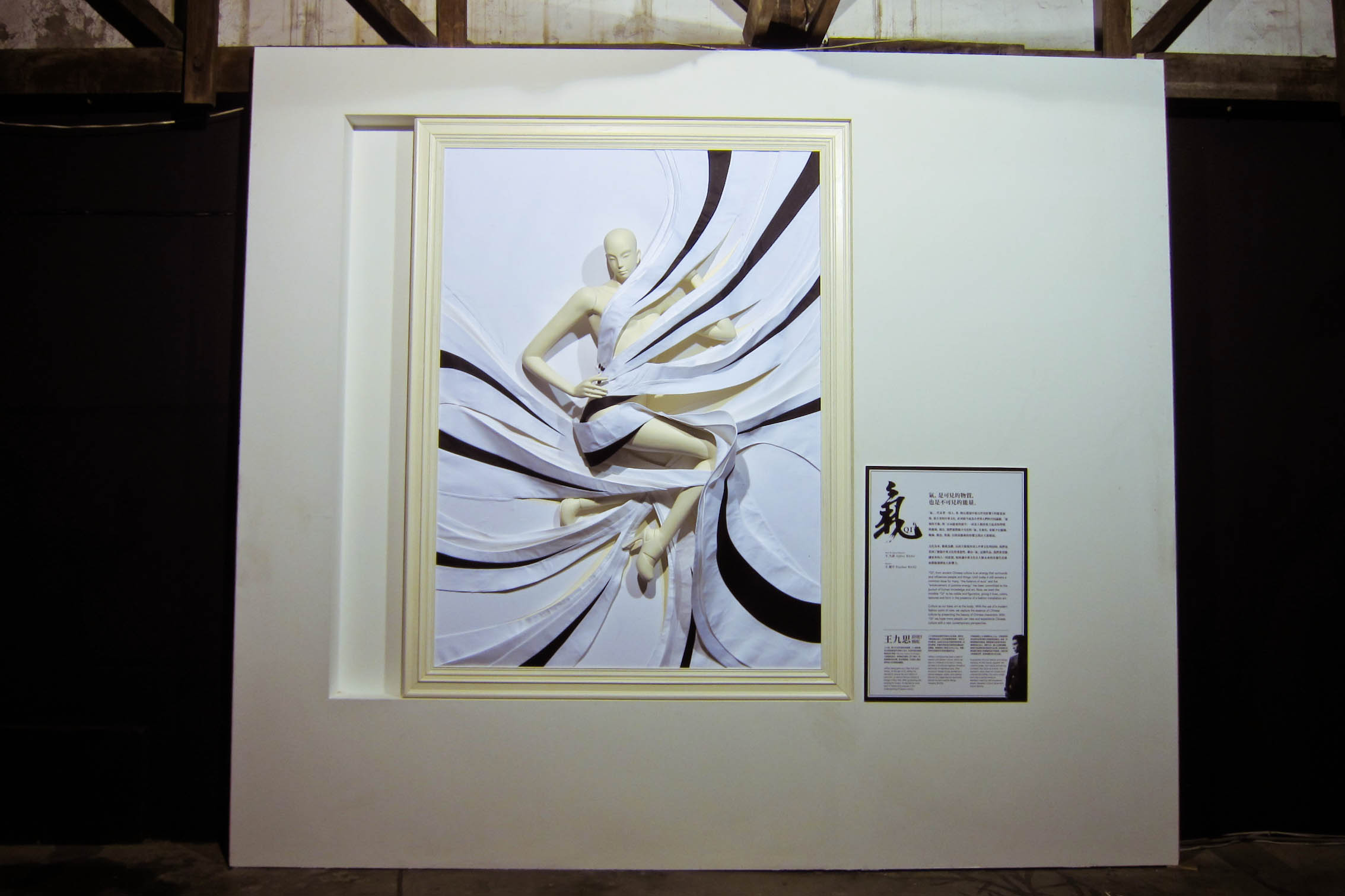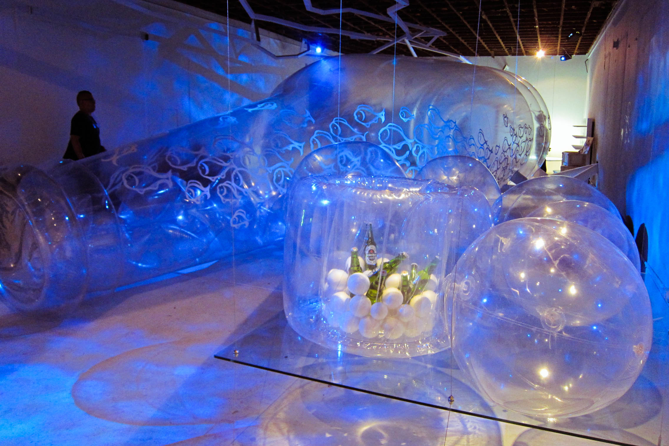 知名平面設計師蕭青陽的立體作品「啤酒潛水艇」令人耳目一新,只要拉開拉鍊,就可以一腳踩進長達九公尺的透明大啤酒瓶裡,換個角度看世界。前一秒還徜徉在海底世界,下一秒就已經騎上新媒體藝術家林俊廷的透明木馬,在心跳聲中重啟轉動不停的彩色童年。同一個展場的另一邊,又是完全不同的境界。時尚設計師王九思漢字新解,用黑白布條拉出「氣」的張力,靜止的作品搭配製作過程的影片,呈現出奇妙的幻境。沉澱情緒後走進對面的展區,彷彿掉進另一個異次元。藝術家 AKIBO 李明道的作品「光虫」彷彿帶著大家回到未來,在充滿童趣科幻世界中面對自己心底深處最真實的情感。來自香港的 CM Leung 人生就是一次又一次的跳躍,從羽球教練到文字記者再到攝影師,一張張顛覆傳統思維的婚紗照,背景可以是荒漠,也可以是閩南圍龍,冷調處理的畫面突顯新人之間的溫度。