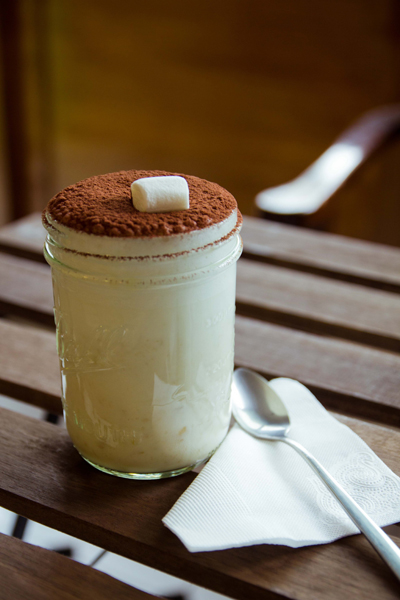 早午餐從 8:00 供應至 14:00,提供各式各樣變化豐富的早餐盤,其中「公雞經典早餐盤」最受歡迎,14:00 之後,提供各式飲品和點心,亦有當日獨家的神祕餐點,依據當天早上他們去市場採購的新鮮食材推出不同菜色,有咖哩飯等等。最推薦的飲品則是香蕉牛奶,用玻璃瓶盛裝的香蕉牛奶,上面灑滿可可粉再加上一顆棉花糖,一端上桌就讓我們忍不住驚嘆太可愛。看的見濃郁香醇的真材實料,吃得到紮實香蕉顆粒,一杯喝下去相當有飽足感。