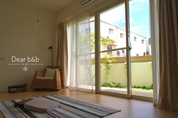 一樓寬闊的小草四人房,鑰匙上有隻會吃草的可愛小羊。轉開木門,走過雪白的隔板屏風,妳和姊妹們被眼前的大空間驚喜,小沙發和兩張大大的床,還有依著木頭床櫃的日式延伸到一旁的榻榻米區,推開落地窗,有一片小草地和卡通裡小丸子跟爺爺常坐著的那個木頭緣側,坐在上頭,腳丫子在外頭晃呀晃的,給陽光曬曬,感受不刺腳的溫暖,就這麼放空一個下午,做一個暖洋洋的白日夢。