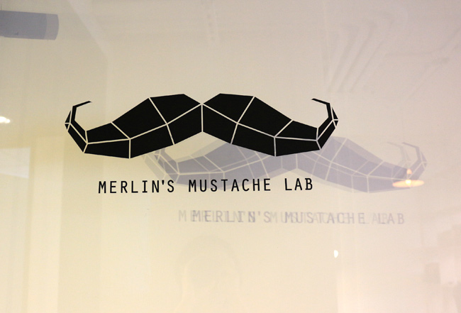 工作室玻璃門上貼著具有3D維度的鬍子,標示了梅林鬍子實驗室深植在骨子裡的數位基因。