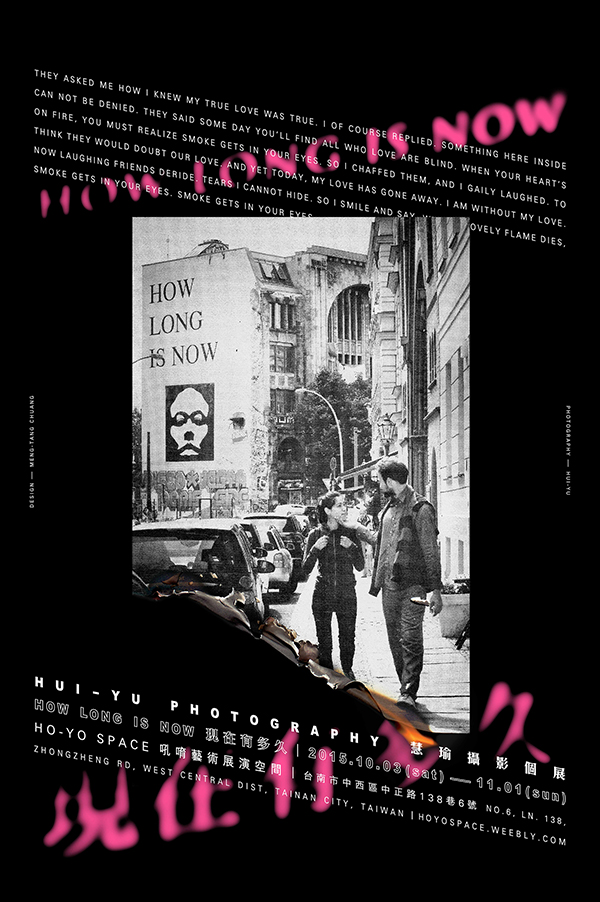 二十四歲那年離開臺灣,慧瑜獨自一人前往歐洲學習發展。或許是孤寂,使得他更加留意身邊每個充滿愛意的神情。他總是不由自主地觀察人與人之間的關係,也無法停止記錄每個感動他的瞬間。每當快門釋放,他的情緒彷彿也得到了寄託。一個人的旅行,一個人的生活,一次又一次與人相識、離別,讓他領悟到「當下」的美好。「現在有多久呢?」答案或許存在於他與平面設計師莊孟唐所製作的宣傳海報裡——烈火燒盡後,僅存感動的當下。