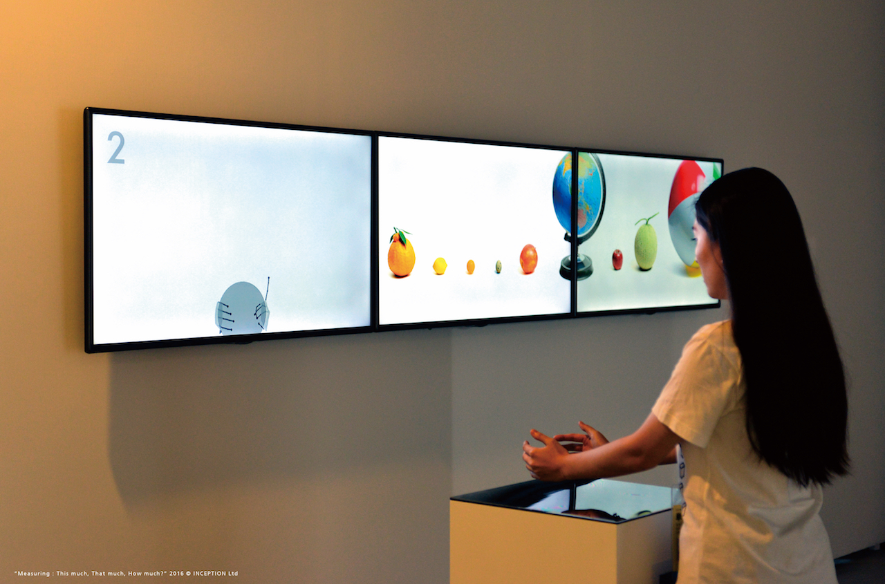 「單位展」in Taipei 大致可以區分為三大空間,第一個空間著重在「單位的體驗與定義」,透過「比較」或是「實體展示」的概念,將「單位」展現出來。例如 1 公斤有多重?5 秒鐘有多長?1 公尺的標準是什麼?1 公升的水裝在容器中有多少?甚至我們最常使用來作為 3C 產品記憶體的 1GB 究竟等於可以存放多少影像或文字?甚至像「蘋果有多大?」這麼抽象的問題,也能透過互動感知器自己比畫比畫,就知道比出來的到底是蘋果還是西瓜?