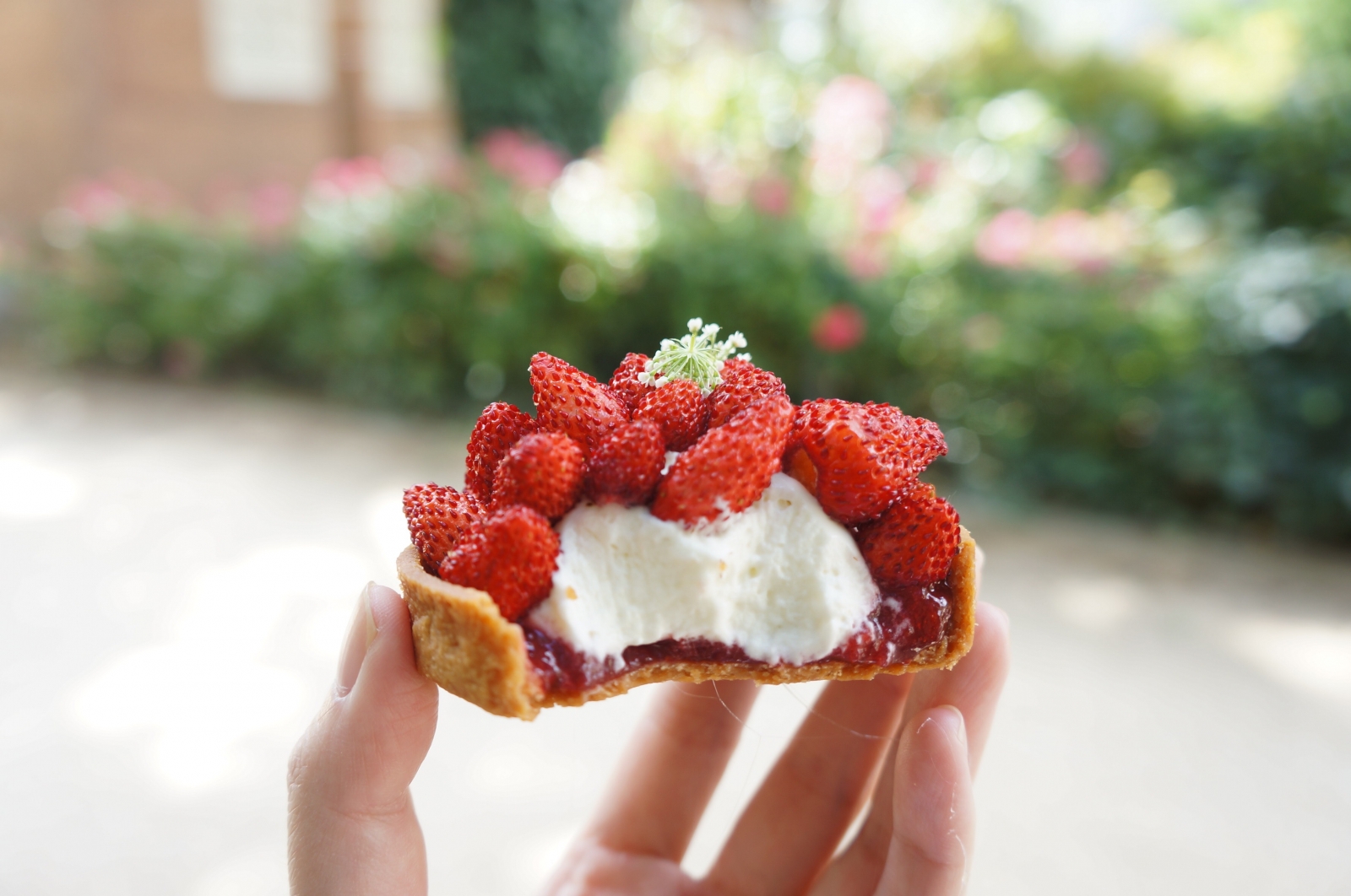 圖1:Des Gâteaux et du Pain 的甜點「Fragaria Vesca」(野莓)。簡單的一個野莓塔,也有塔皮、糖煮野莓、繡線菊奶醬、新鮮野莓與接骨木花等五種組成。(攝影:Ying C.)