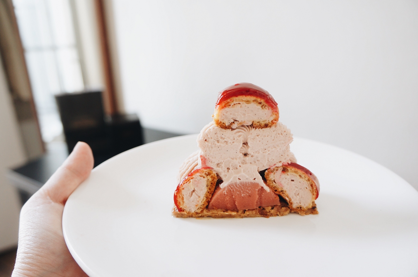 圖2. 巴黎甜點店 Angelina 的 St. Honoré 「Désiré」,是由底部的花生醬奶酥脆片(croustillant crumble)取代傳統的千層派皮,再加上泡芙、草莓奶醬夾心(coeur crémeux à la fraise)、覆盆子香緹鮮奶油(Chantilly à la framboise)、泡芙上的翻糖裝飾與頂部的一片造型白巧克力構成。(攝影:Ying C.)