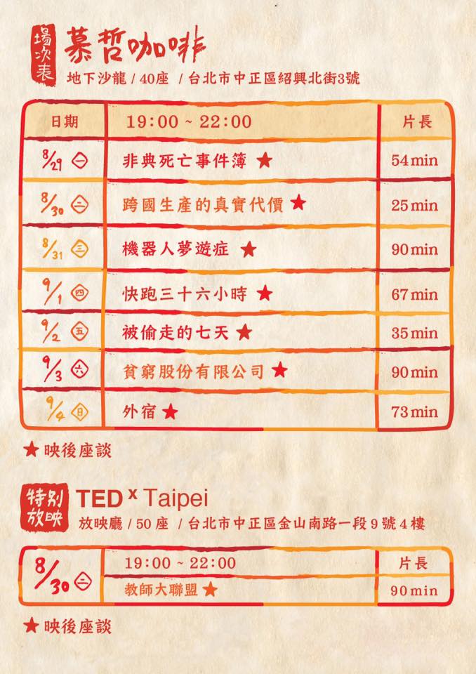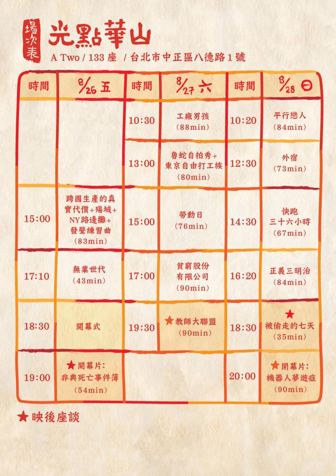 本次影展將於 8 月 26 日至 8 月 28 日期間假光點華山電影院,放映精選國內外優秀 的 18 部勞動影像作品,並於 8 月 29 日至 9 月 4 日於慕哲咖啡舉辦連續七天的放映座談,包含《非典死亡事件簿》《跨國生產的真實代價》《機器人夢遊症》《快跑三十六小時》《被偷走的七天》《貧窮股份有限公司》《外宿》共七部精選影片,現場邀請經驗豐富的工會幹部、非營利組織工作者、學者前來與談。此外,特別于 TED x Taipei 舉辦特色影片《教師大聯盟》的放映,並邀請導演與全國教師工會總聯合會對談。