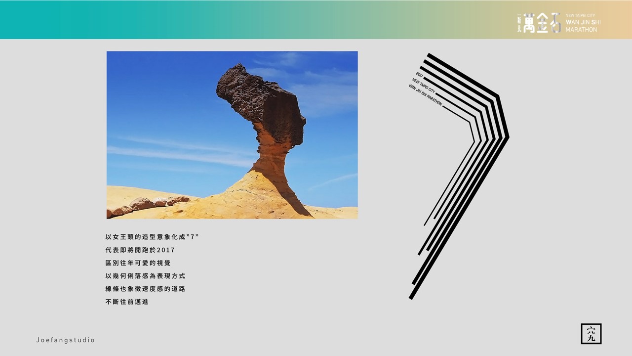 2017 年新北市萬金石馬拉松於去年宣布,將透過賽事深度結合新北觀光文化與創意產業,特邀知名設計師方序中親自操刀設計選手跑衣,歷經兩個月的引頸期盼,終於在 1 月 6 日正式公開發表。「將女王頭的造型意象化成『7』,畫作七條道路,代表即將開跑於 2017。以幾何俐落感為表現方式,深色為基底,讓主題色更加鮮明,線條象徵充滿變化的地形道路,山形與海形的意象呼相輝映,也像是一道一道正在前進的光束,充滿挑戰且不斷往前邁進。」方序中的設計巧思驚艷全場,不僅突破傳統意象,還採用了時尚的黑底配色、讓參與過歷屆賽事的選手們耳目一新。