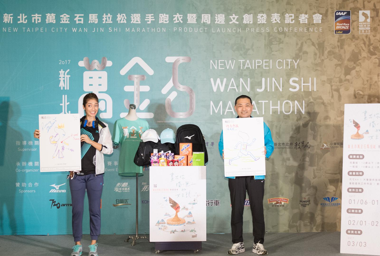 而向來親民的新北市副市長侯友宜不僅擔任走秀神秘嘉賓、為各位示範男版跑衣,還上台與 Rima 一同揮毫作畫。侯副市長將女王頭化身俏皮跑步選手,將作品命名為「銀色奇雞」代表 2017 新北市萬金石馬拉松將在雞年邁向銀標的意象,讓大家為之驚艷;而 Rima 以「Queen」為主題,「我畫的女王有個皇冠、a good heart (一顆善良的心)、腹肌、還有很強壯的肌肉。」