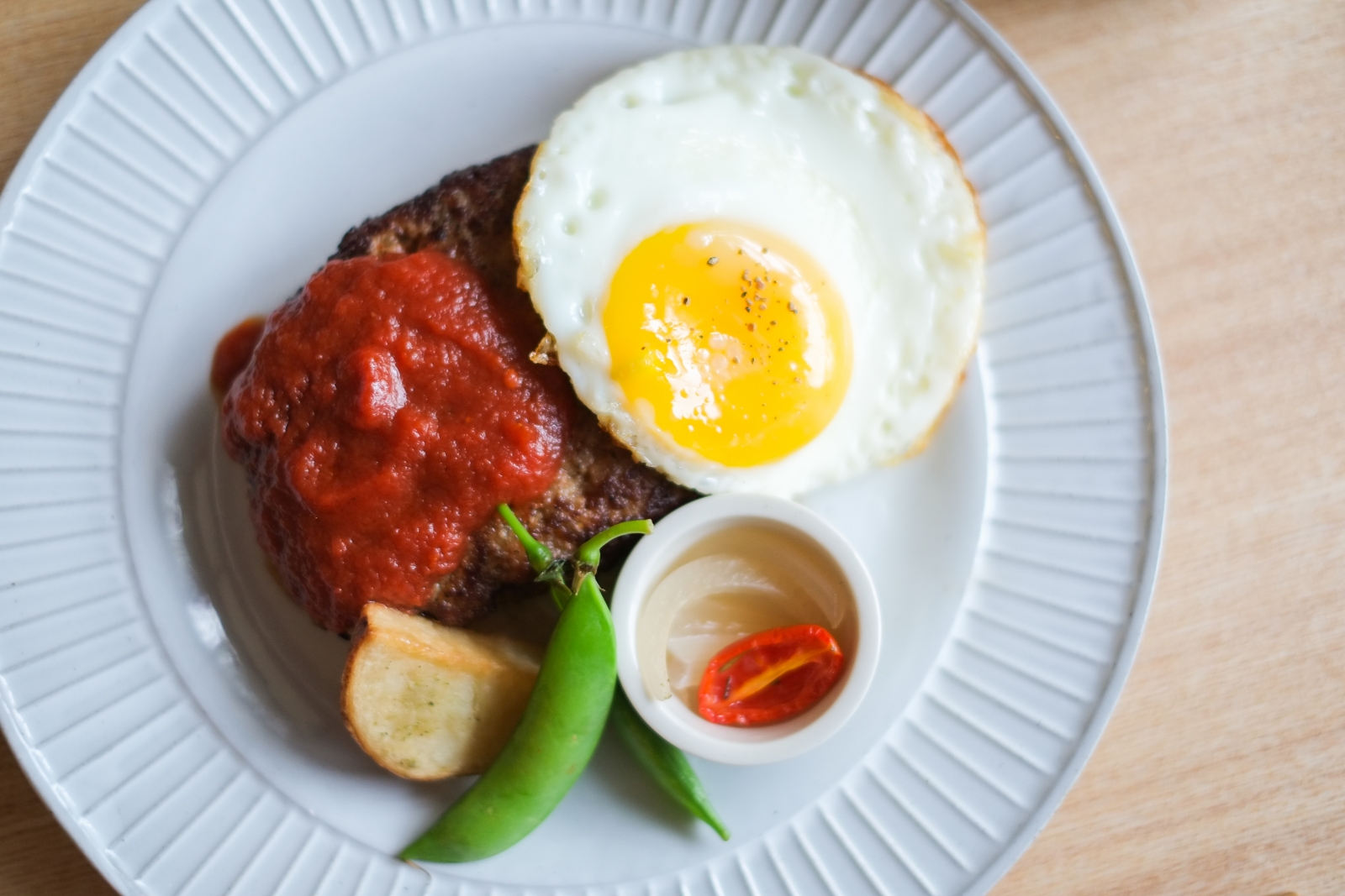 | 溫州店的漢堡排,混合 70% 牛肉與 30% 豬肉,搭配炒過的洋蔥,佐自家製番茄醬汁,再鋪上令人垂涎欲滴的半熟太陽蛋,純手工製作的漢堡肉排厚實新鮮,洋溢著淡淡的洋蔥香氣,是喜歡肉感的朋友一定不能錯過的餐點。 |