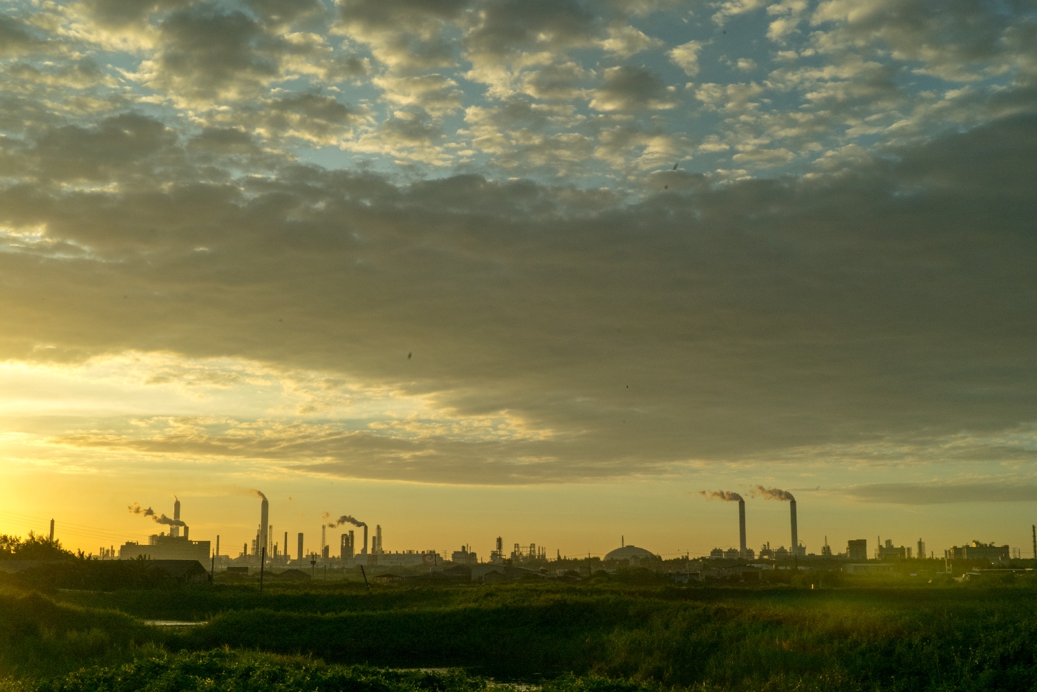接著,鏡頭切到一個台灣老人的臉孔,耳梢掛著快被風吹走的口罩,兩眼無神地眺望遠方一根根煙囪,正肆無忌憚地排放廢氣……