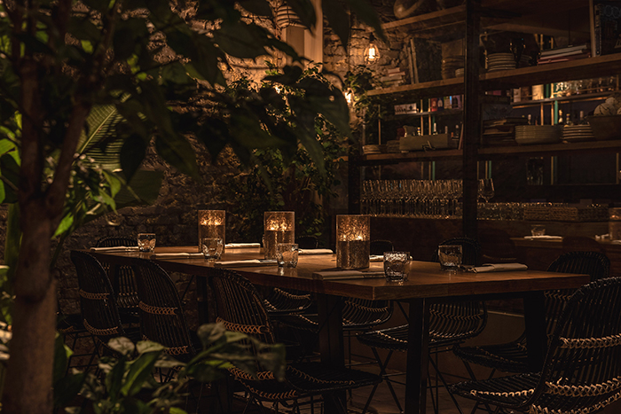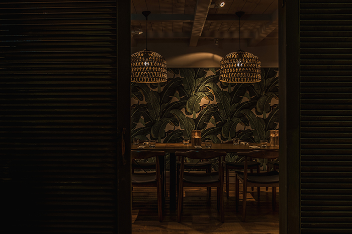 如:一樓吧檯的西班牙幾何花磚、沙發區英式風格家具、地下一樓包廂濃厚拉丁美洲熱帶風情的芭蕉葉壁紙…等。此外,充滿質樸台灣味的包廂竹籃燈罩、訂製藤椅亦反映著日據時代台灣竹藤工藝的興盛,搭配充滿熱帶風情的綠色植栽,整體空間輕鬆閒適,最適合在結束忙碌工作後的夜晚時光,前來以美味餐點、創意酒飲犒賞辛勞一日的身心脾胃。