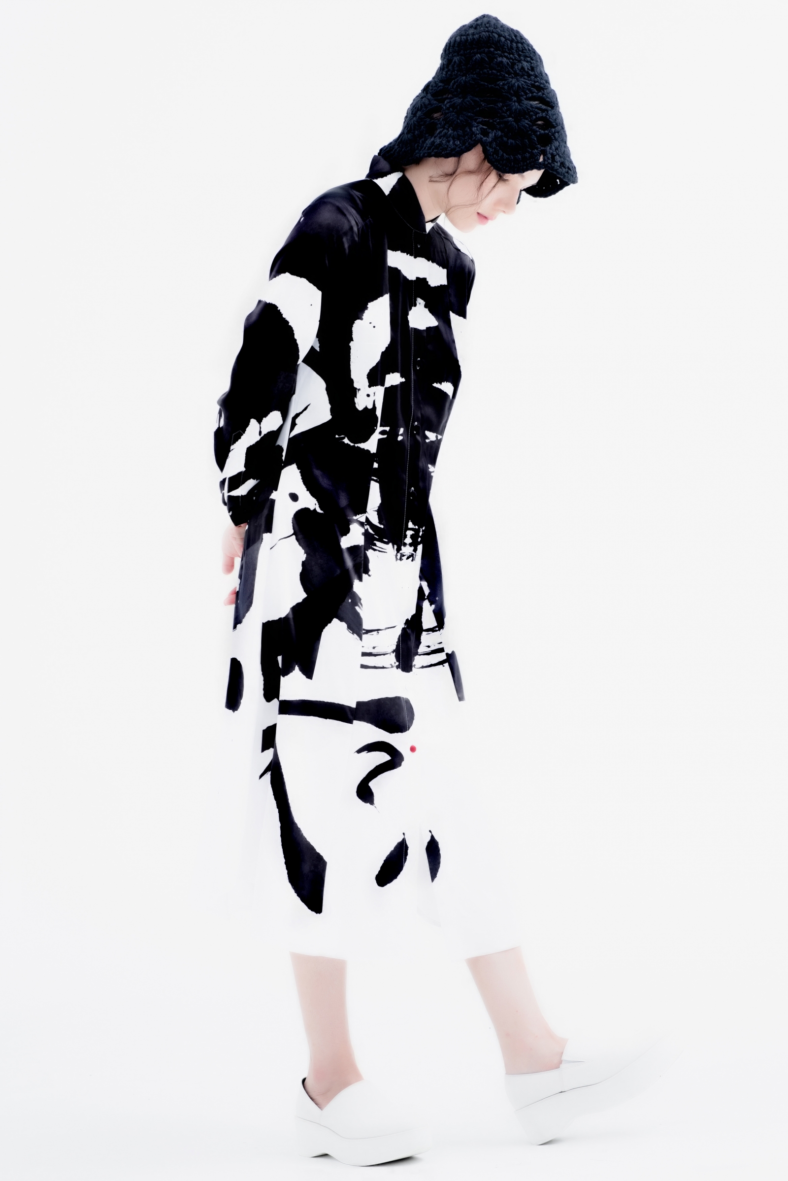 在款式上,APUJAN 保有品牌常見的旗袍領、馬蹄袖等東方傳統服飾元素;書畫線條則採用不同材質的印花印製,並與不同材質的紗線織成緹花,以強調水墨線條的特點:濃淡、筆順、不規則且自然暈染的形狀。詹朴巧用東方線條的獨特性組建服裝構圖,讓線條的蔓延與跳動,化作一組組無聲的音符,織成一首以線起舞的進行曲。