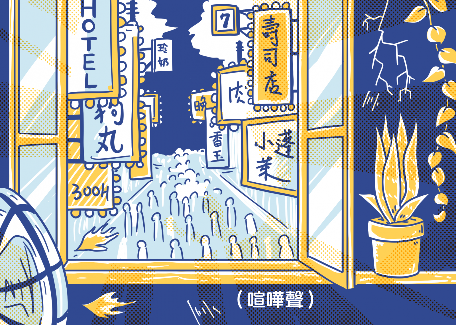 瑤臺旅社二樓二五號房的窗戶,正遙遙向著圓環那邊的夜市。人語笑聲,一陣陣浪頭似捲了上來,間或有一下悠長的小喇叭猛然奮起,又破又啞,夜市裡有人在兜賣海狗丸。對面晚香玉、小蓬萊那些霓虹燈招牌,紅紅綠綠便閃進了窗裡來。房中燠熱異常,床頭那架舊風扇軋軋的來回搖著頭。風,吹過來,也是燥熱的。