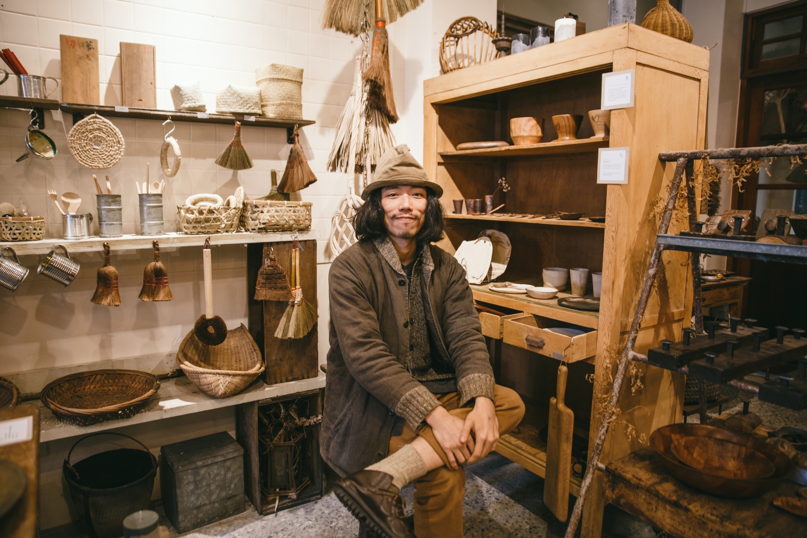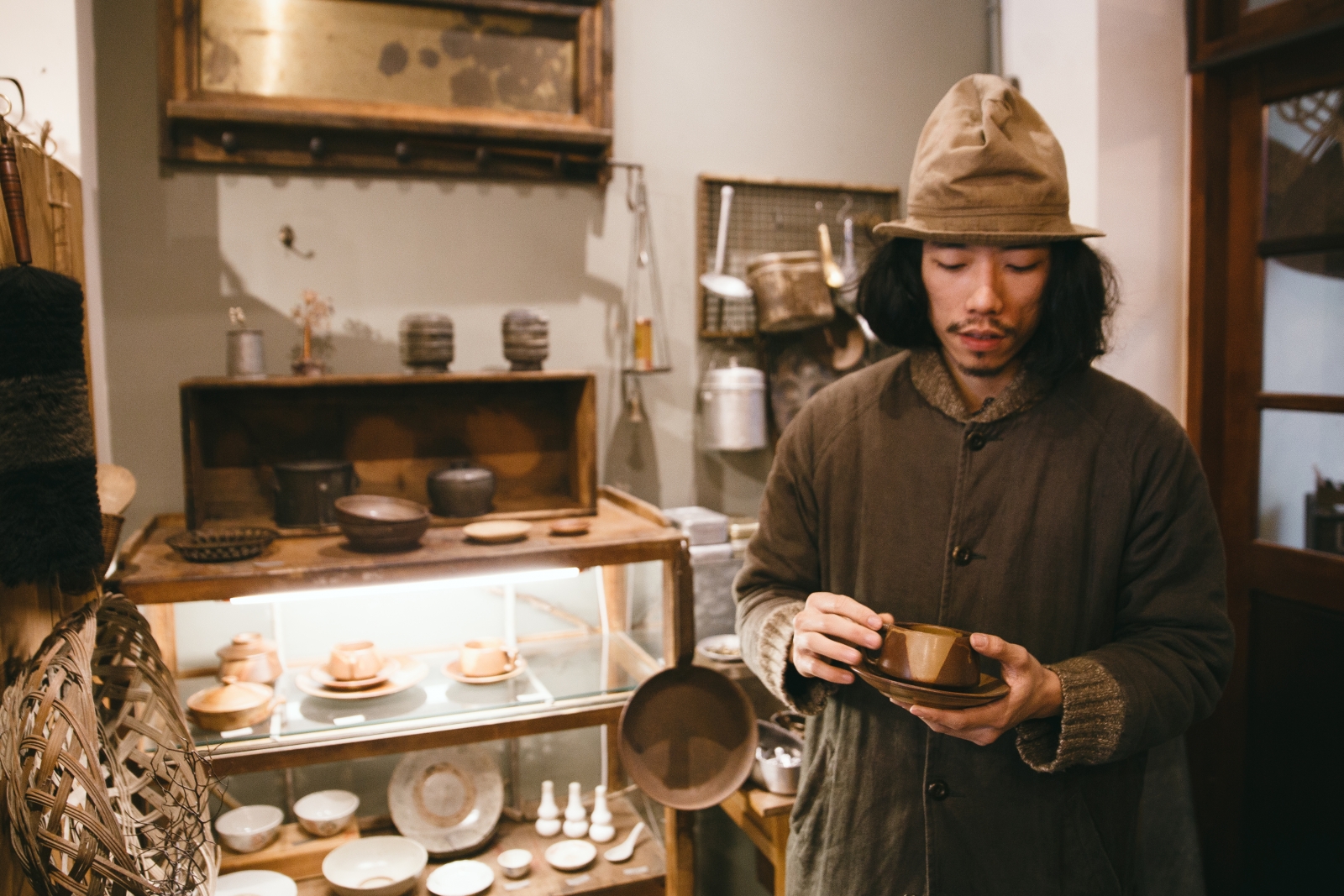 「文化的紋理」可能太抽象,簡單說是一種記憶,像日本客戶走進大稻埕聞到街市內的中藥味﹑乾貨香,就可以立即聯想到台灣一樣的記憶,謝欣翰隨手拿起一只百年陶杯——北投燒為例,北投燒來自於 1897 年日本人在北投設立的窯場所燒製,因為特殊的土壤造就了這只陶杯古樸溫潤的質地,時至今日北投因大量開採與水土保持之故已經無法採到這樣的土質了,結合日本工藝與台灣材質的北投燒,凝結了 20 世紀初期台灣的民間痕跡;還有金屬製品也是謝欣翰覺得很有趣的項目,像是介紹一位朋友一樣說道:「錫太曖昧了,沒有銀的硬度,也沒有金的延展性,但這樣的柔軟度最像人的皮膚,錫的花器溫潤,可以過濾雜質的錫作為酒器更顯酒的香醇。」,其他像是整塊木頭手工鑿出的碗不只紋路叫人深深把玩,更可以用上一輩子﹑皮製包包原始粗糙的況味令人著迷,隨著穿戴者的使用而刻畫出獨特的性格,而店裡各種手工水草掃把﹑棕刷﹑藺草扇﹑竹編器具不僅是商品而已,地衣荒物也帶消費者走進產地學習這些器物如何從植物變成器具,直接走進台灣最富生命力的場景之中,喚起大家小時候的記憶。
