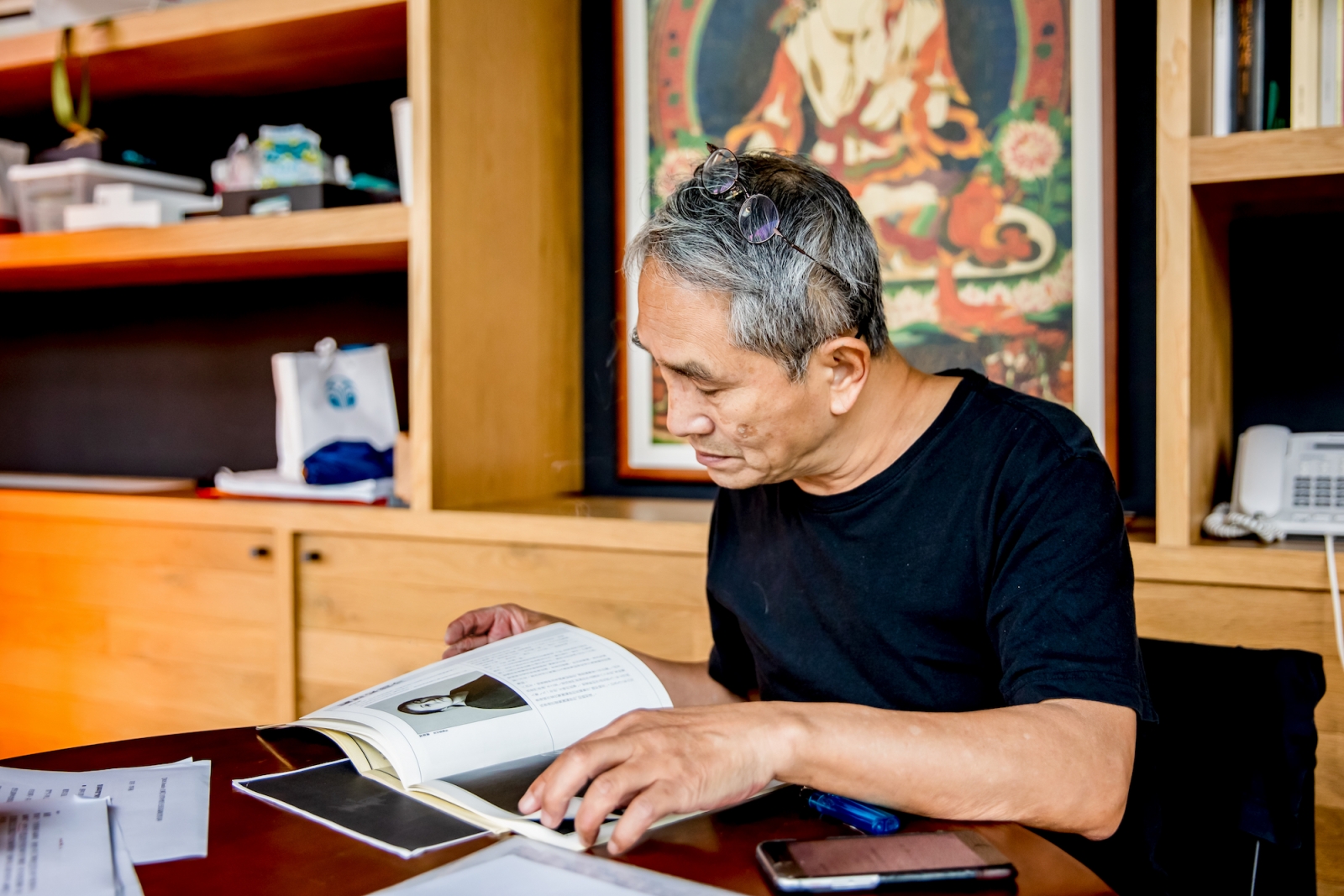 林懷民的桌面,攤開自文獻室找出的節目冊子,84 年的《冬之旅》、94 年的《春之祭》、96 年《黎海寧Link(s) X世代》⋯⋯,指間翻到一幀編舞家年輕時長髮紮起而素淨的黑白肖像,林懷民看著,自時間那方的回望。那時窗玻外樹影婆娑,映著這劇場外長長的廊道。