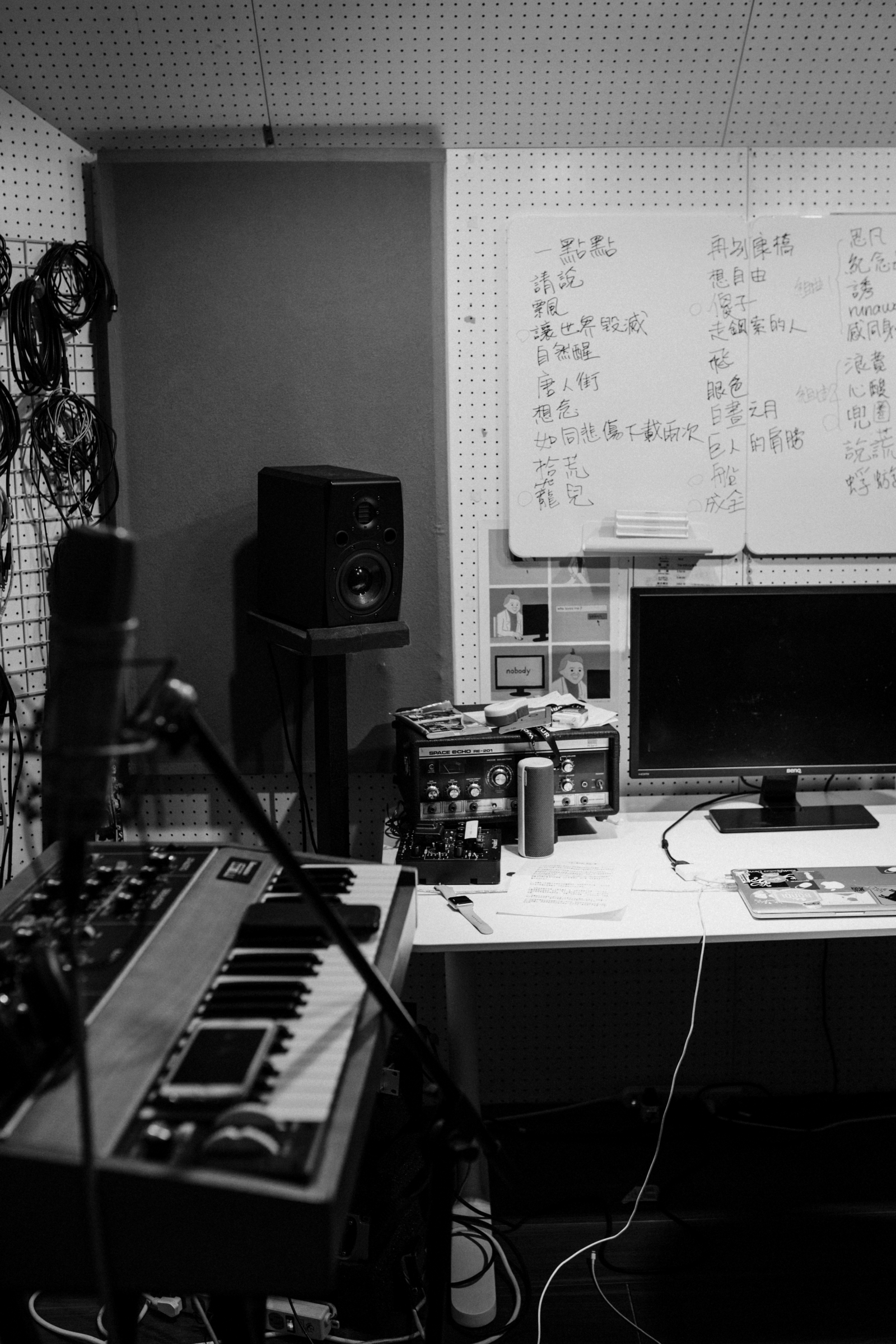 採訪這天,台北迎來近期難得舒服的好天氣。我們來到韓立康位於大安的音樂工作室,剛完成林宥嘉 idol 演唱會的他,在演出裡擔任音樂總監,錄音室電腦螢幕上掛著的白板,還寫著幾天前演唱會的歌序。迎接我們的除了韓立康,還有那隻十四歲的白貓呼呼,柔軟的貓毛悠哉趴在地板磨蹭,牠與主人同樣帶著溫柔和善的氣質 。